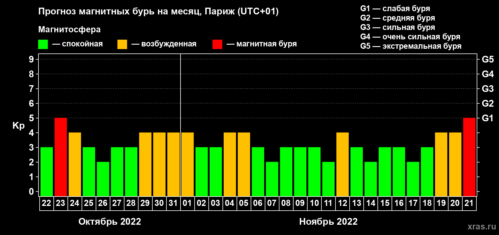 Прогноз магнитных бурь в Париже на 22 октября 2022 года