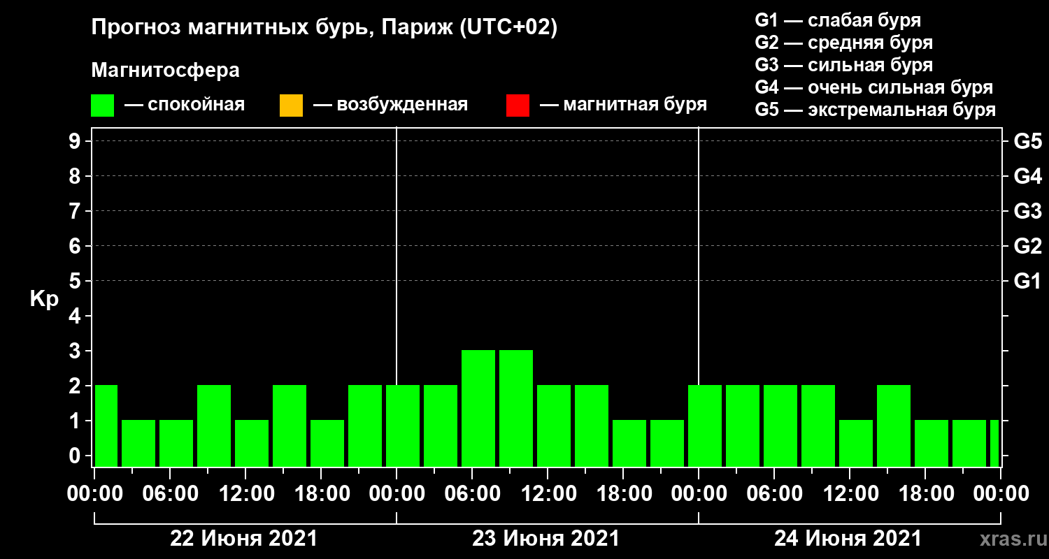 Прогноз магнитных бурь в Париже на 22 июня 2021 года