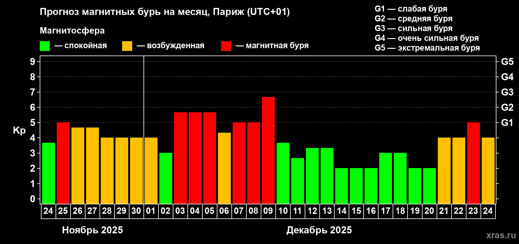 Прогноз магнитных бурь в Париже на 24 ноября 2025 года