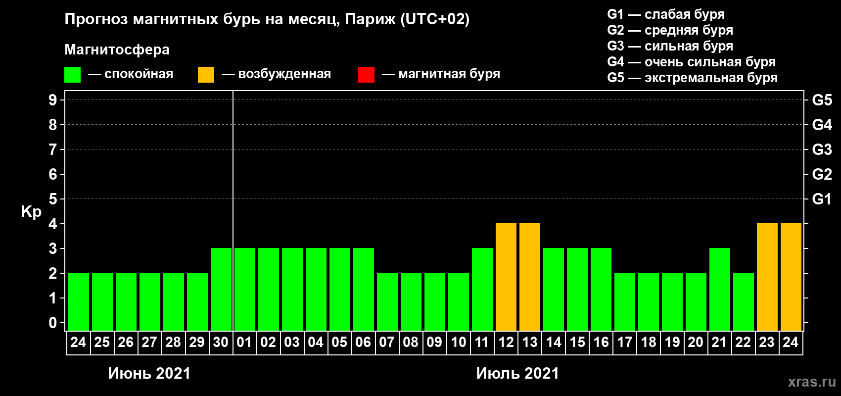 Прогноз магнитных бурь в Париже на 24 июня 2021 года