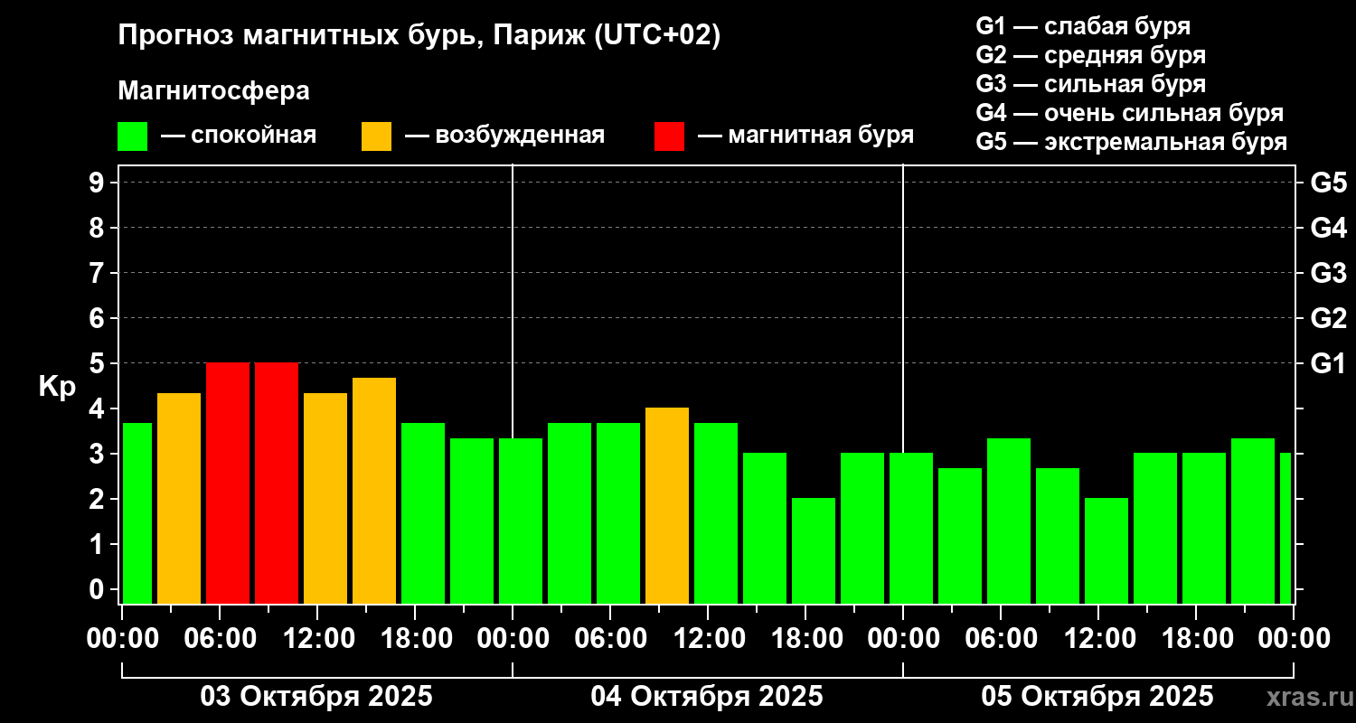 Прогноз магнитных бурь в Париже на 3 октября 2025 года