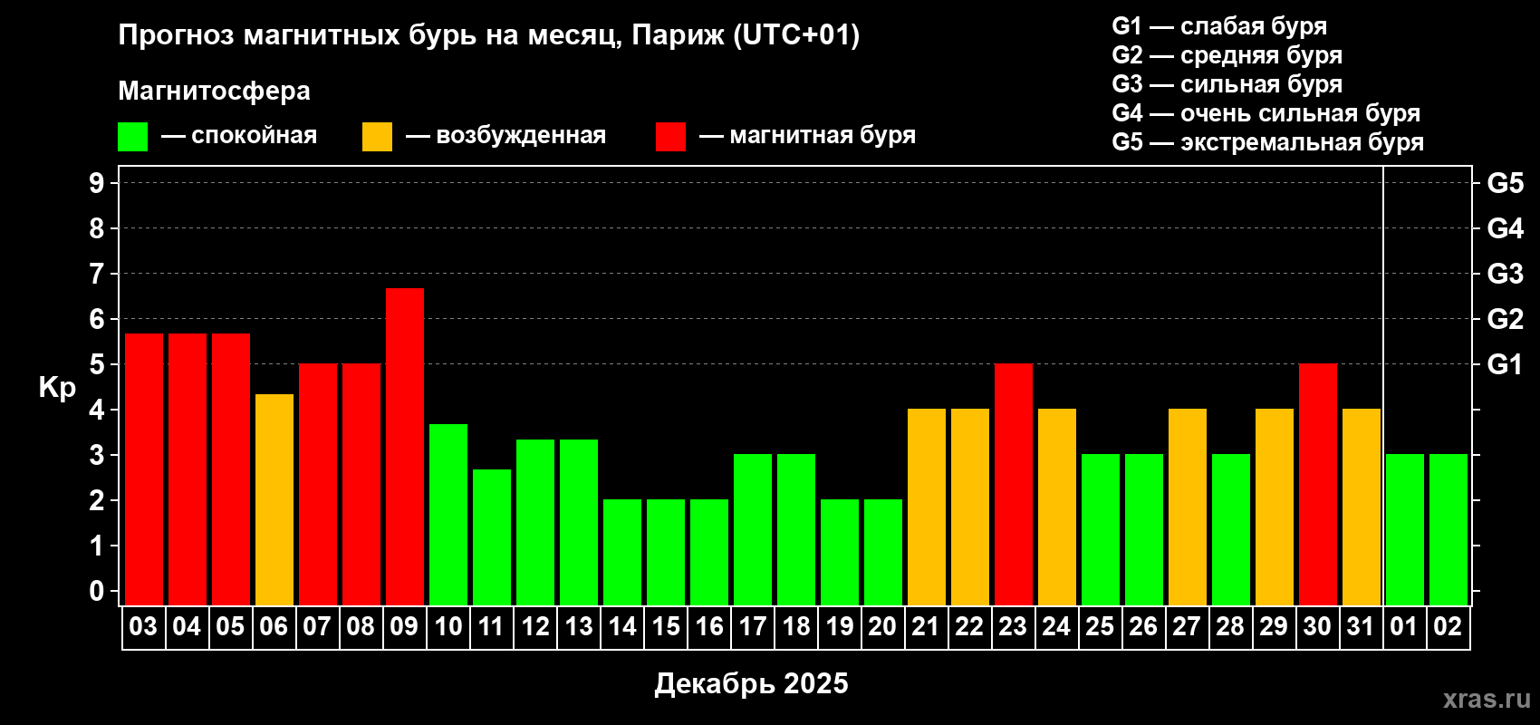 Прогноз магнитных бурь в Париже — 3 декабря 2025 года