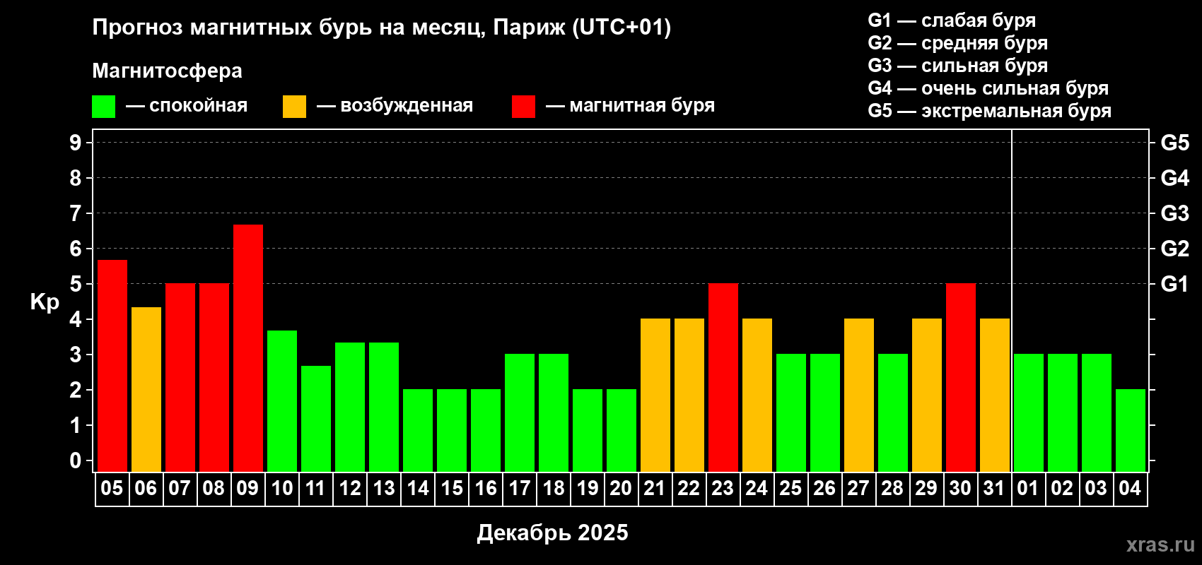 Прогноз магнитных бурь в Париже на 5 декабря 2025 года