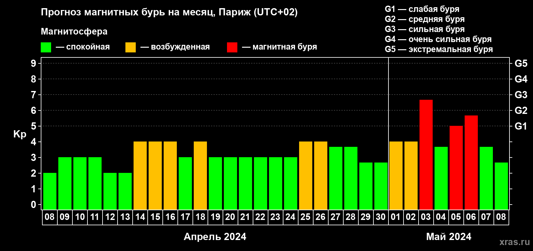 Прогноз магнитных бурь в Париже на 8 апреля 2024 года