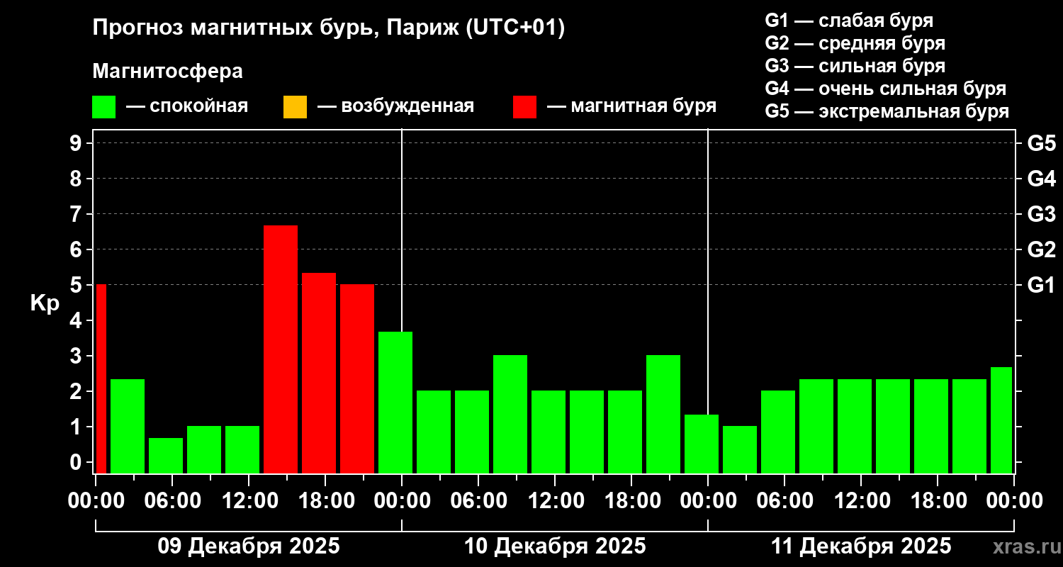 Прогноз магнитных бурь в Париже на 9 декабря 2025 года
