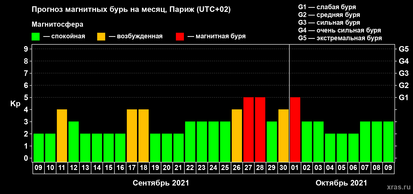 Прогноз магнитных бурь в Париже на 9 сентября 2021 года