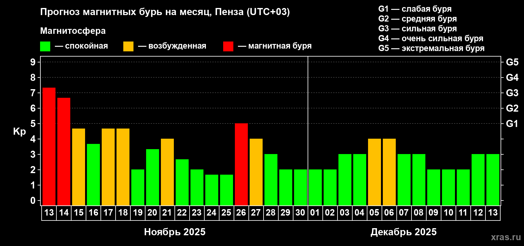 Прогноз магнитных бурь в Пензе — 13 ноября 2025 года