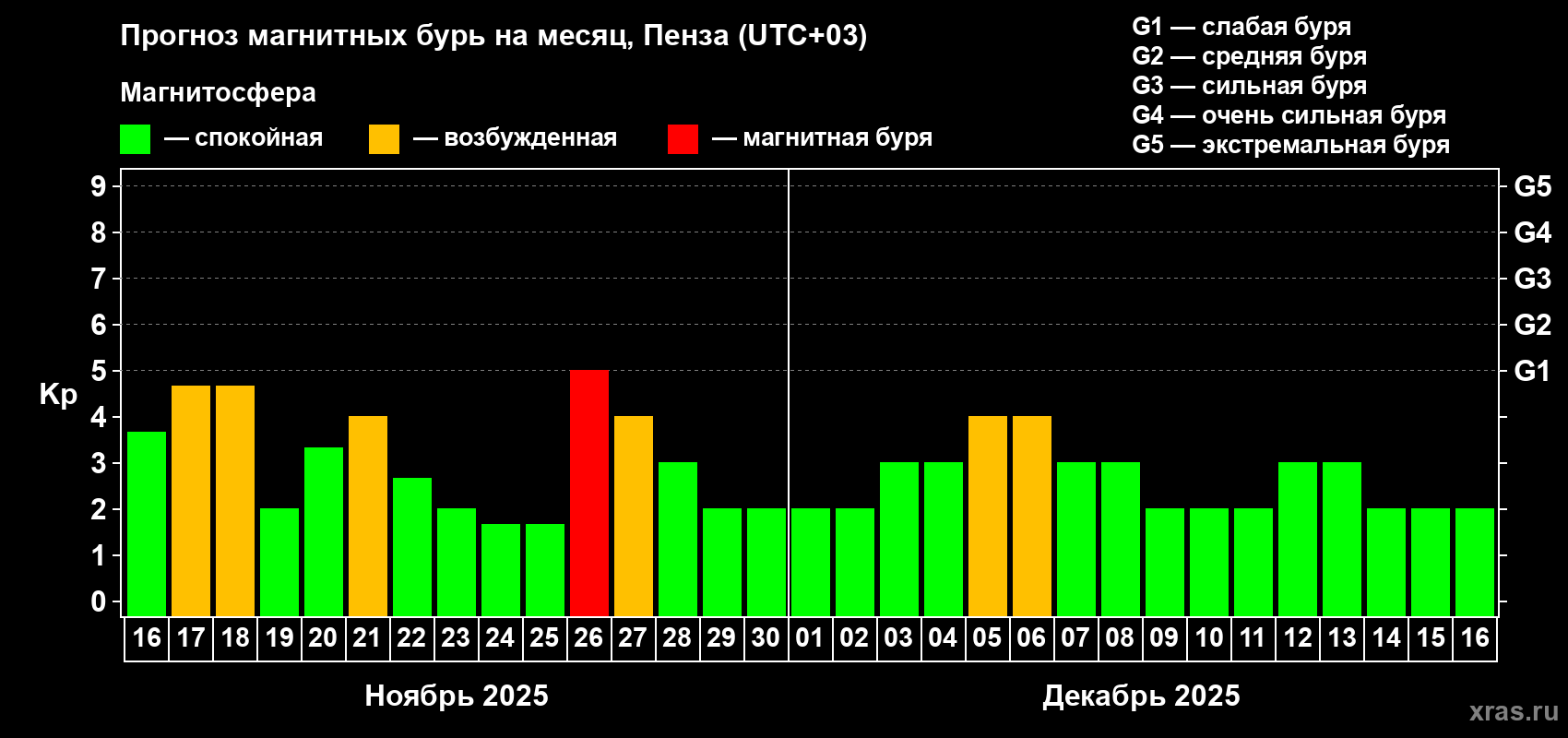 Прогноз магнитных бурь в Пензе — 16 ноября 2025 года
