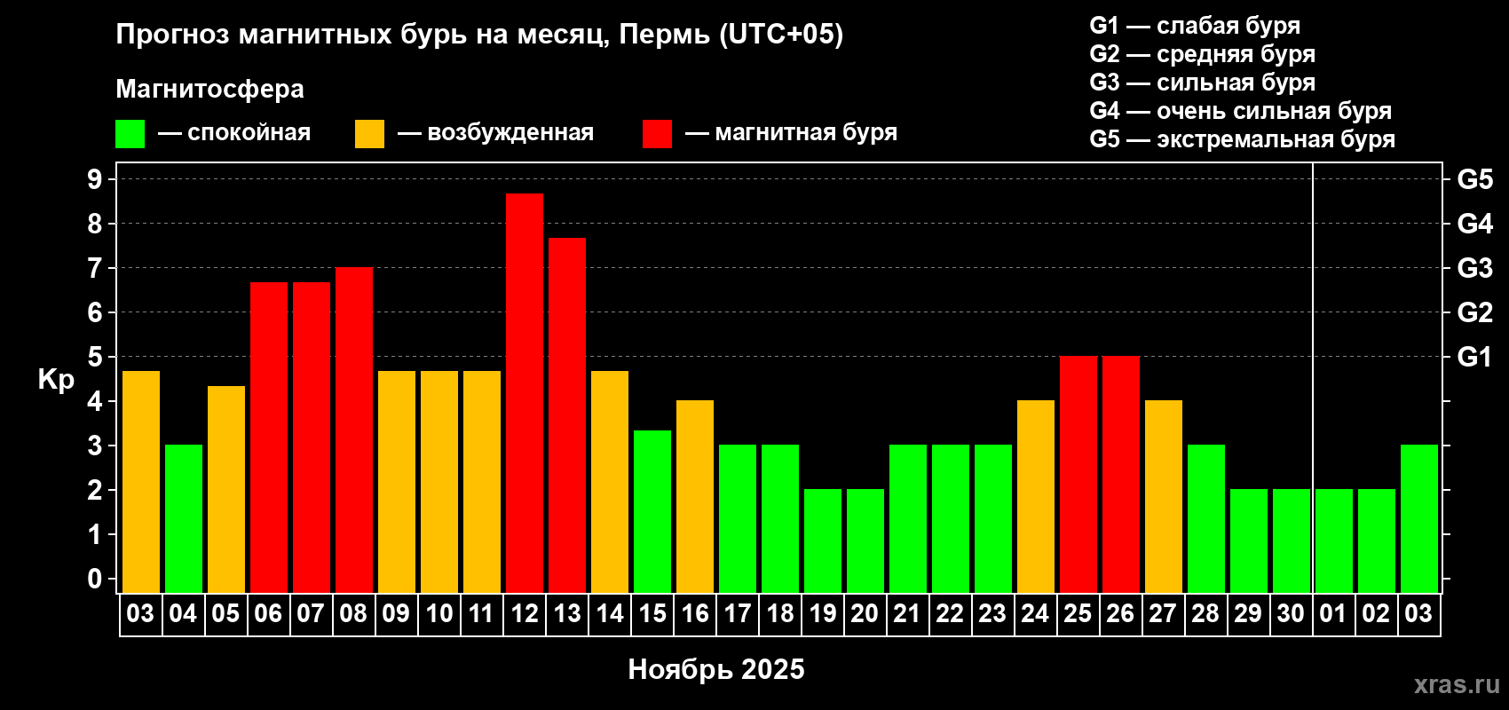Прогноз магнитных бурь Перми — 3 ноября 2025 года