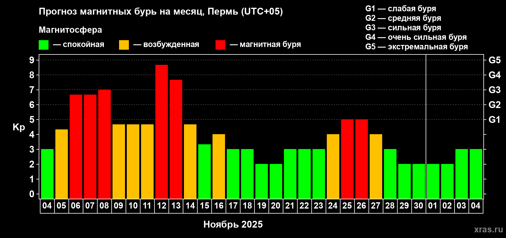 Прогноз магнитных бурь Перми на 4 ноября 2025 года