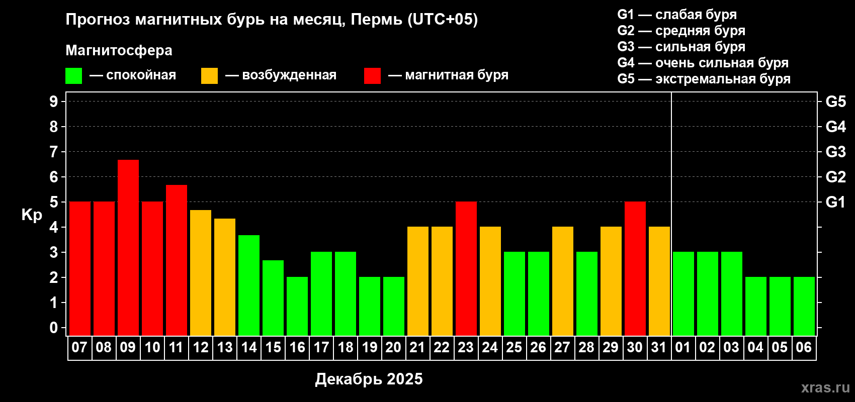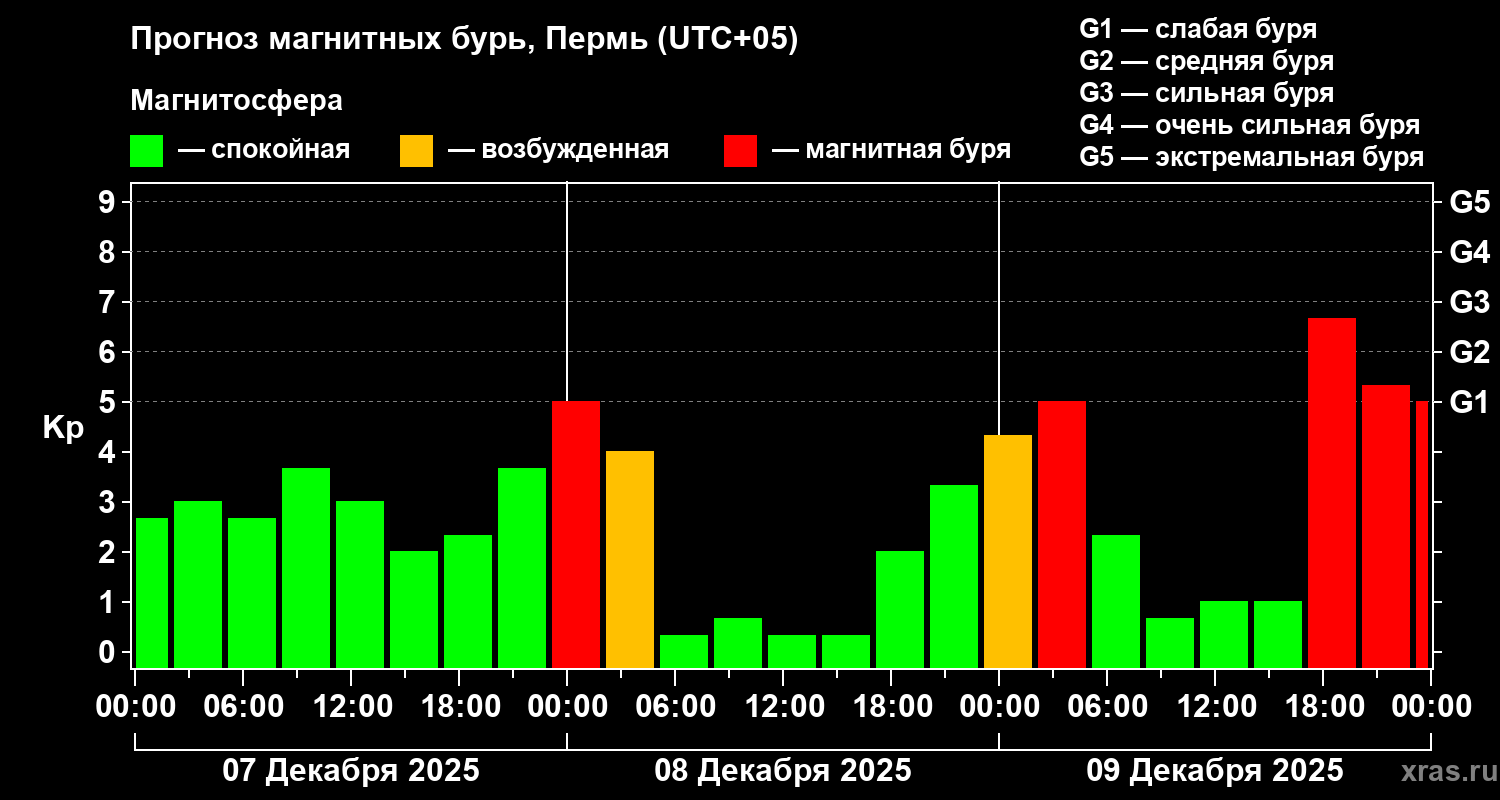 Прогноз магнитных бурь Перми на 7 декабря 2025 года