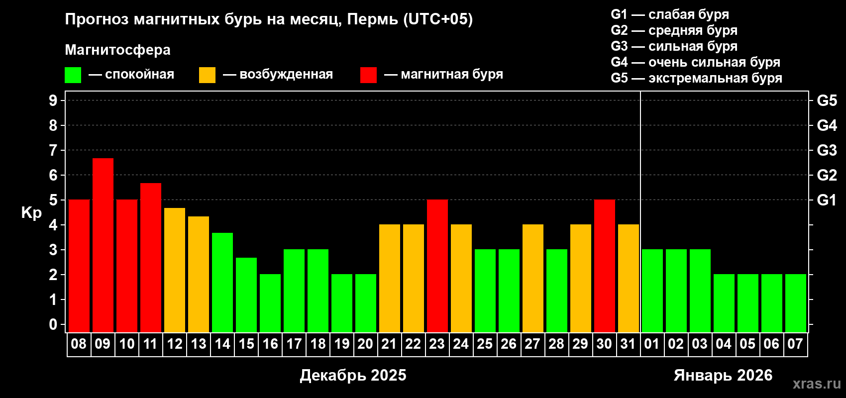 Прогноз магнитных бурь Перми на 8 декабря 2025 года