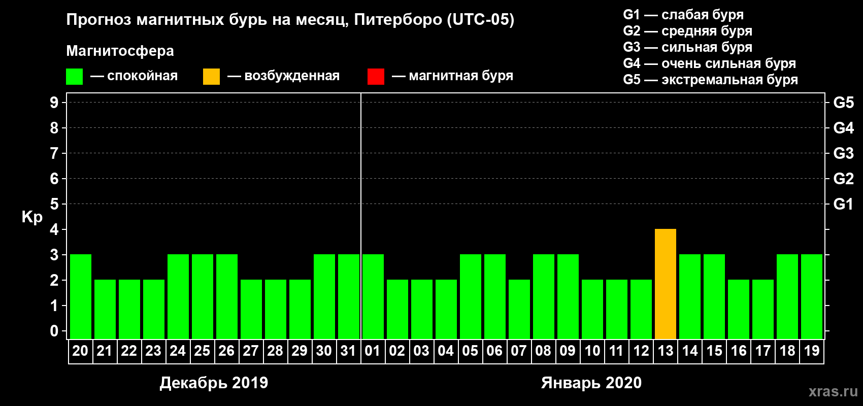 Прогноз магнитных бурь Питерборо на 20 декабря 2019 года