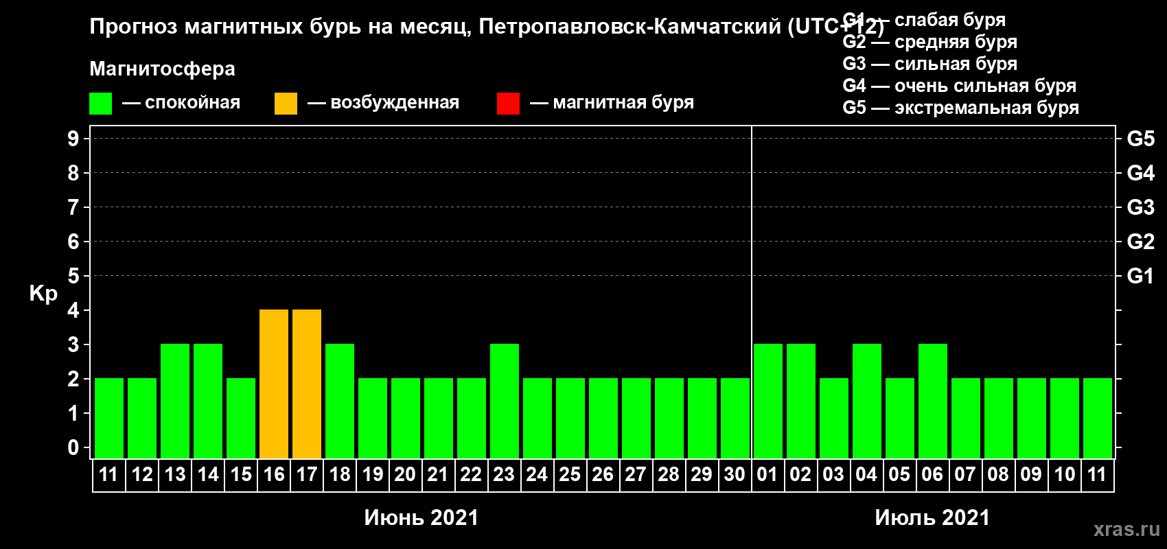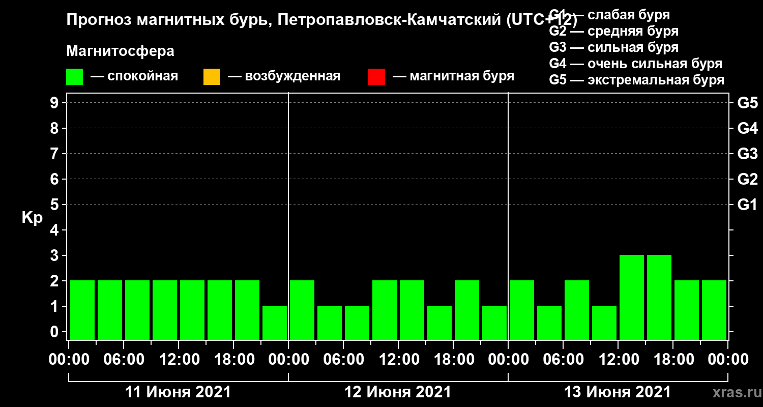 Прогноз магнитных бурь Петропавловске-Камчатском — 11 июня 2021 года