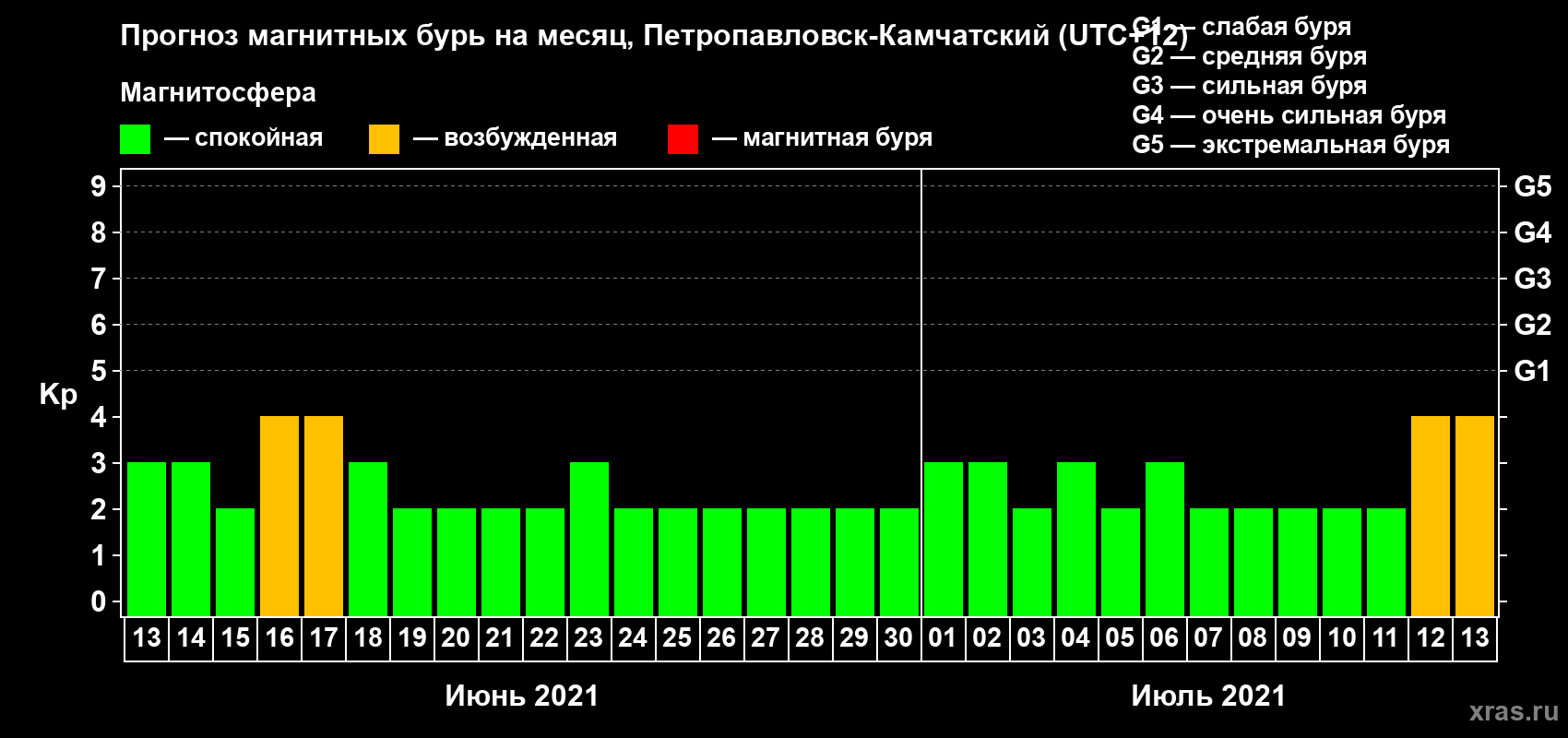 Прогноз магнитных бурь Петропавловске-Камчатском — 13 июня 2021 года