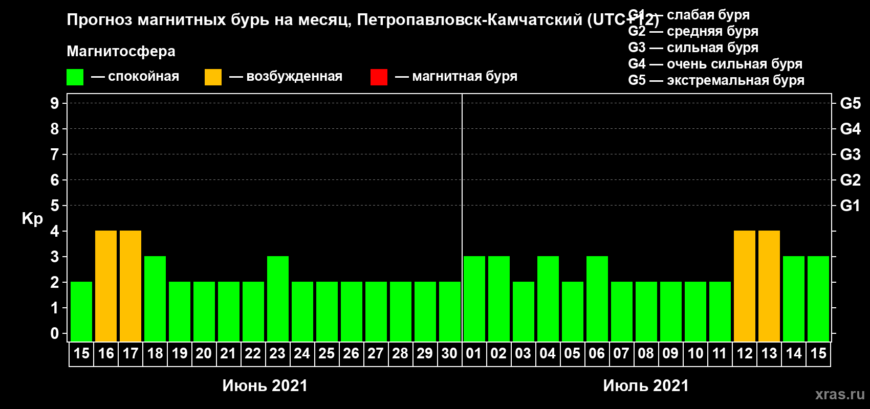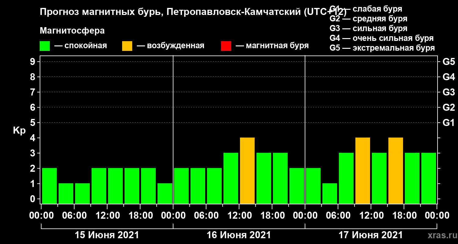 Прогноз магнитных бурь Петропавловске-Камчатском — 15 июня 2021 года