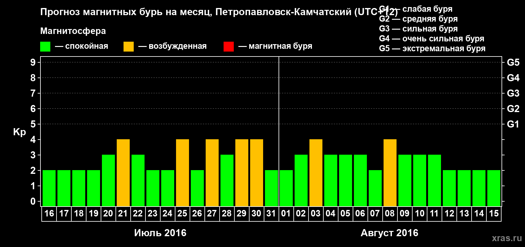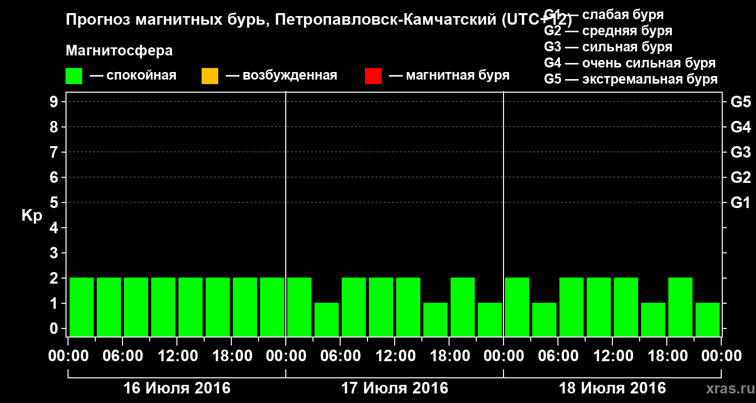 Прогноз магнитных бурь Петропавловске-Камчатском на 16 июля 2016 года