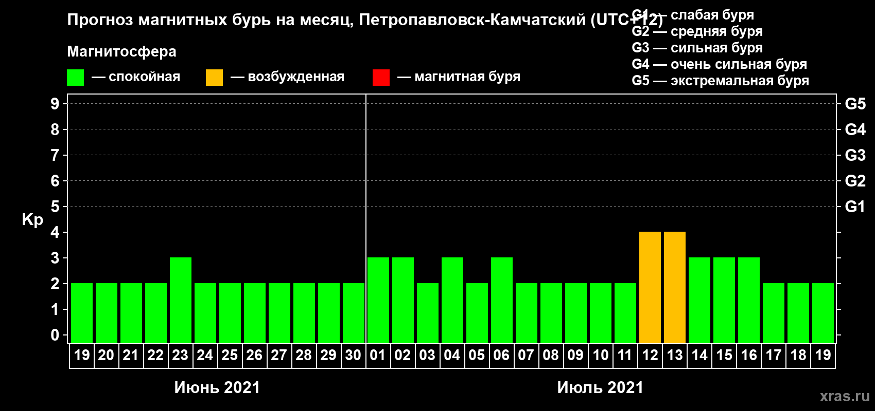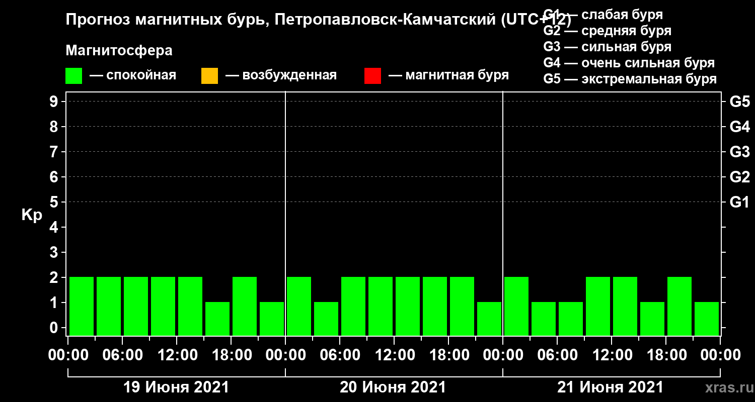 Прогноз магнитных бурь Петропавловске-Камчатском — 19 июня 2021 года
