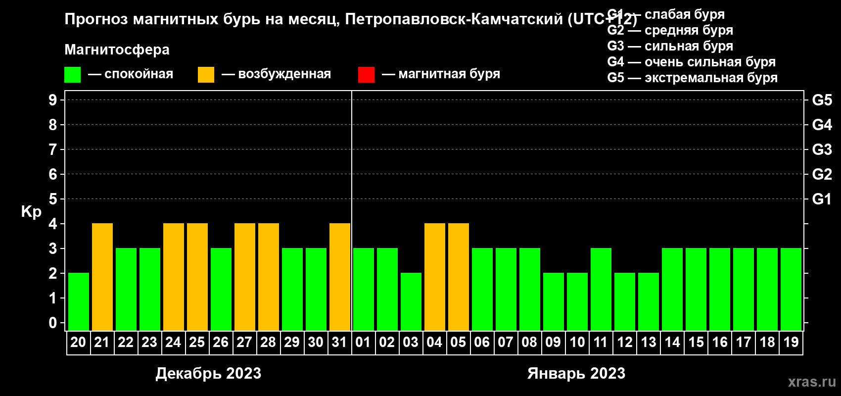Прогноз магнитных бурь Петропавловске-Камчатском — 20 декабря 2022 года