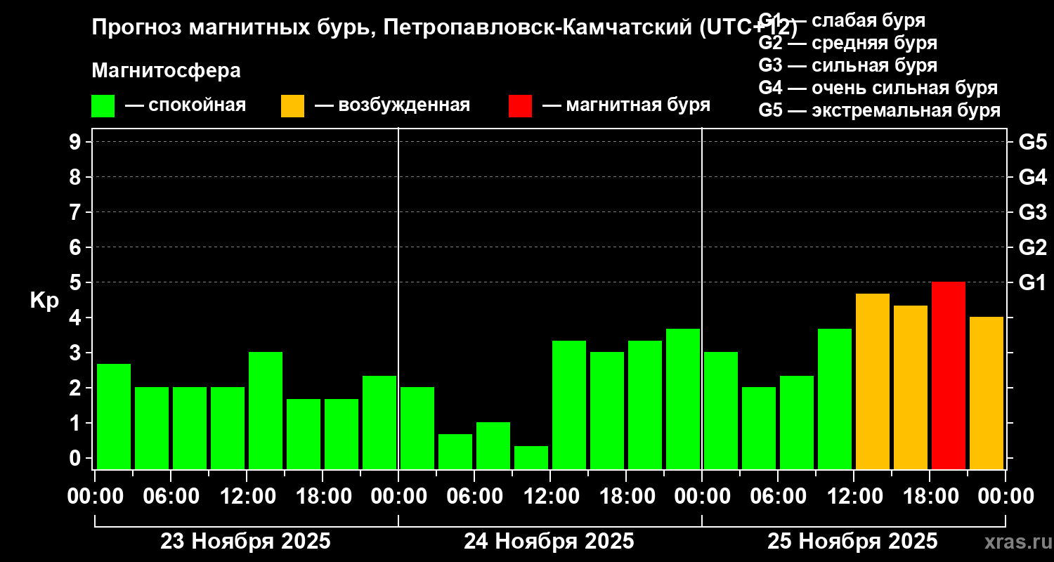 Прогноз магнитных бурь Петропавловске-Камчатском — 23 ноября 2025 года