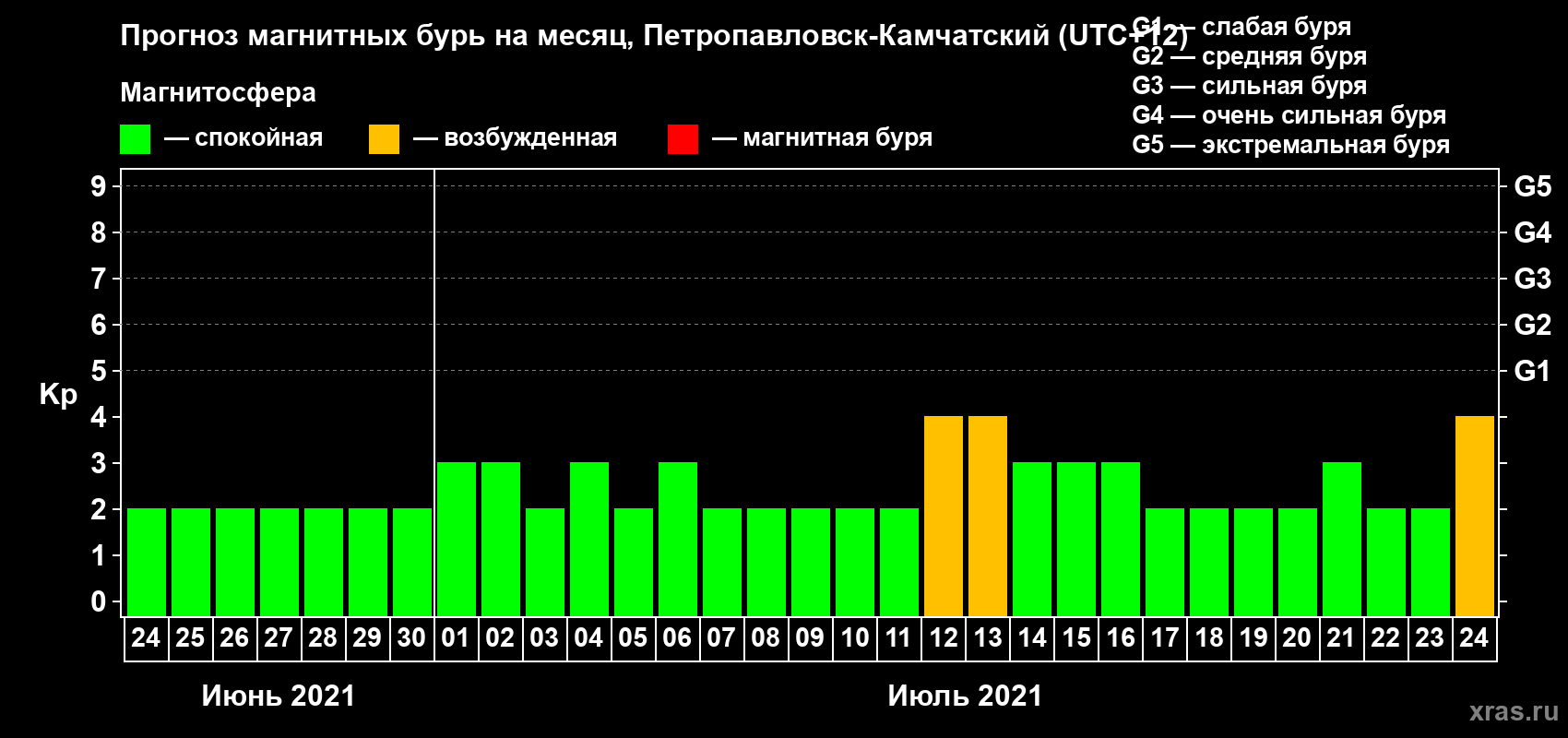 Прогноз магнитных бурь Петропавловске-Камчатском — 24 июня 2021 года