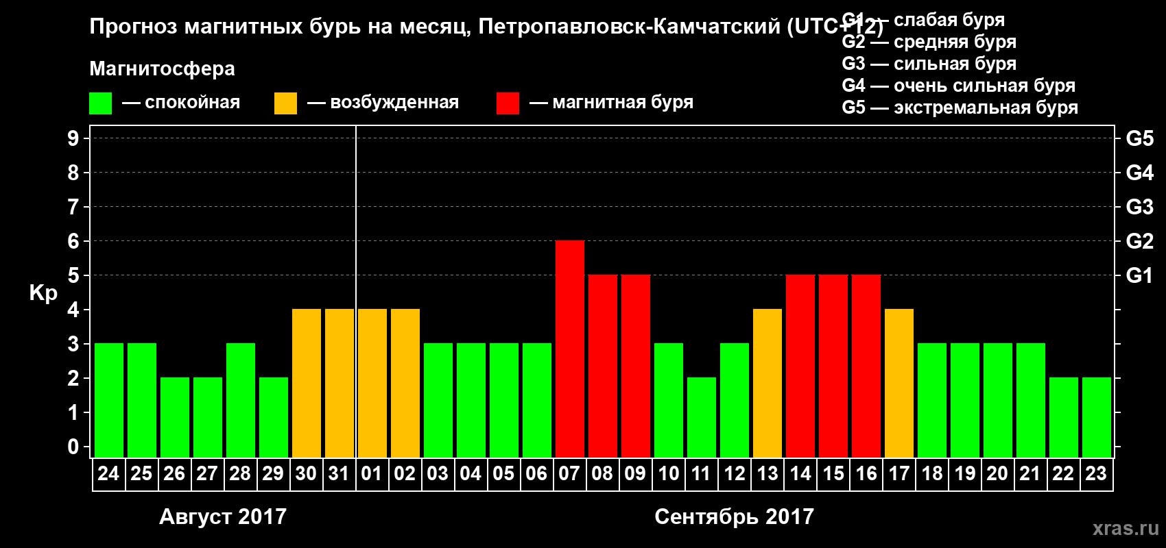 Прогноз магнитных бурь Петропавловске-Камчатском — 24 августа 2017 года