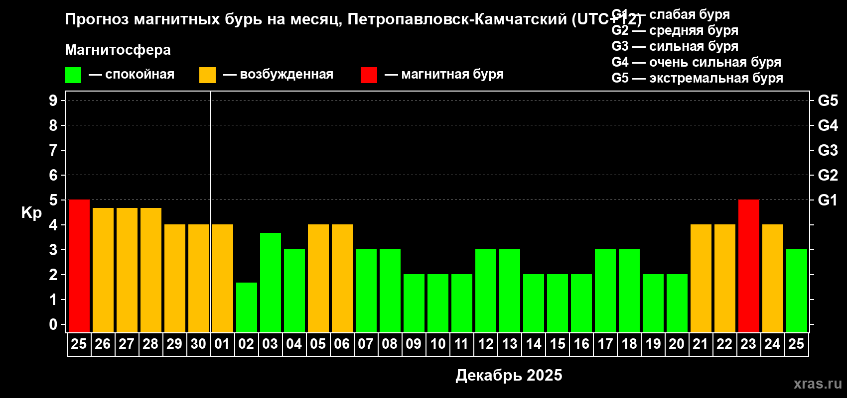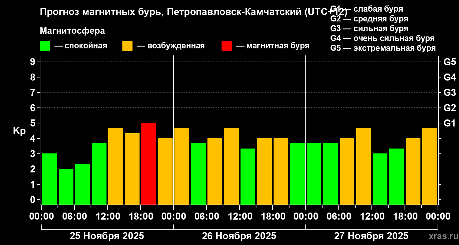 Прогноз магнитных бурь Петропавловске-Камчатском — 25 ноября 2025 года