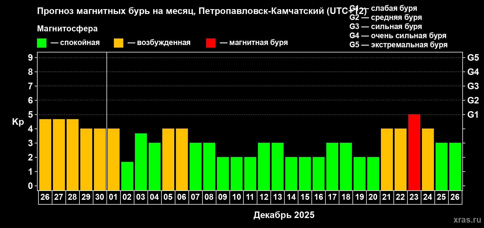 Прогноз магнитных бурь Петропавловске-Камчатском на 26 ноября 2025 года