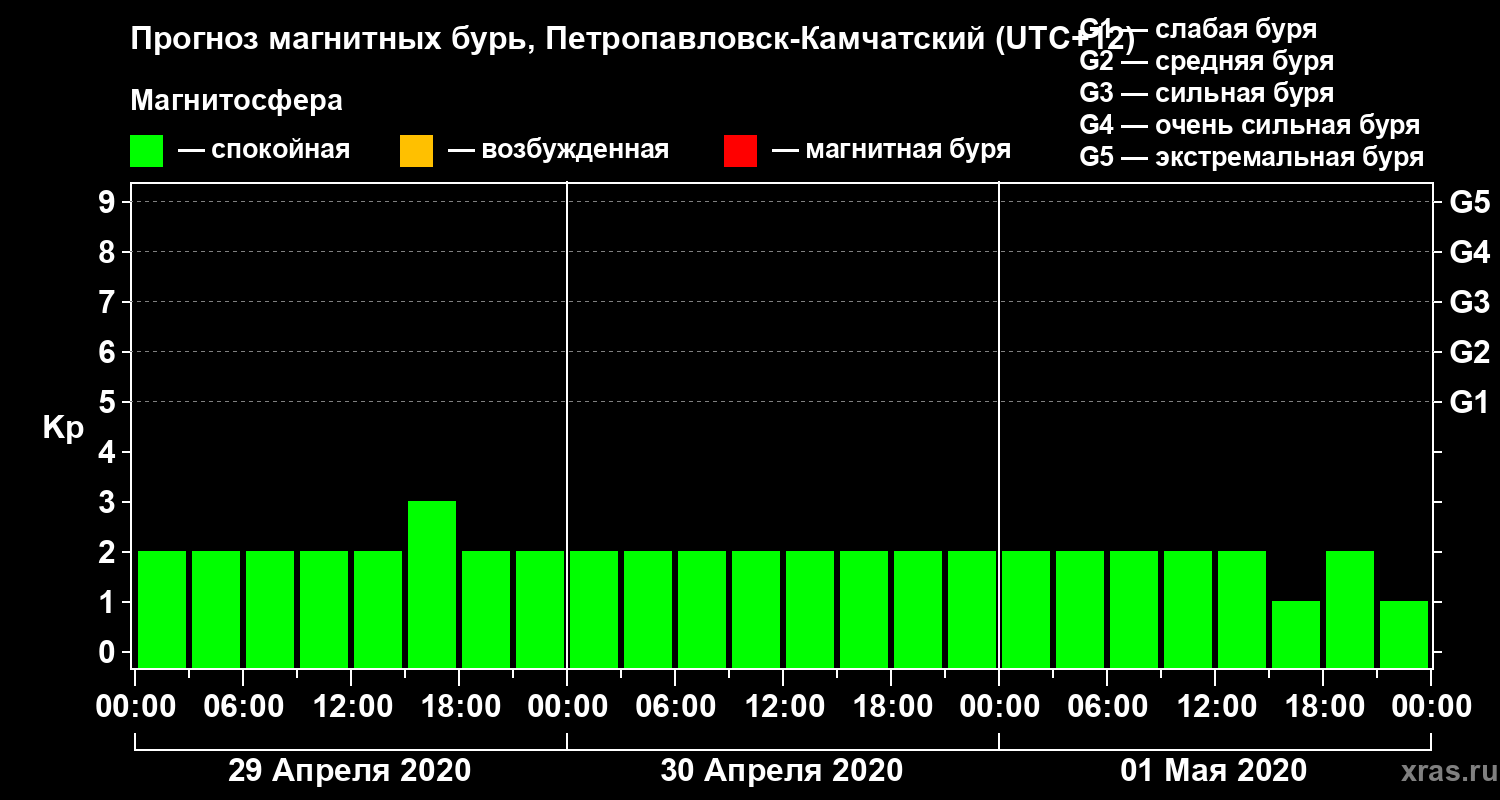 Прогноз магнитных бурь Петропавловске-Камчатском на 29 апреля 2020 года