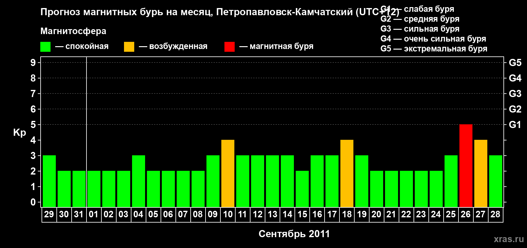 Прогноз магнитных бурь Петропавловске-Камчатском — 29 августа 2011 года