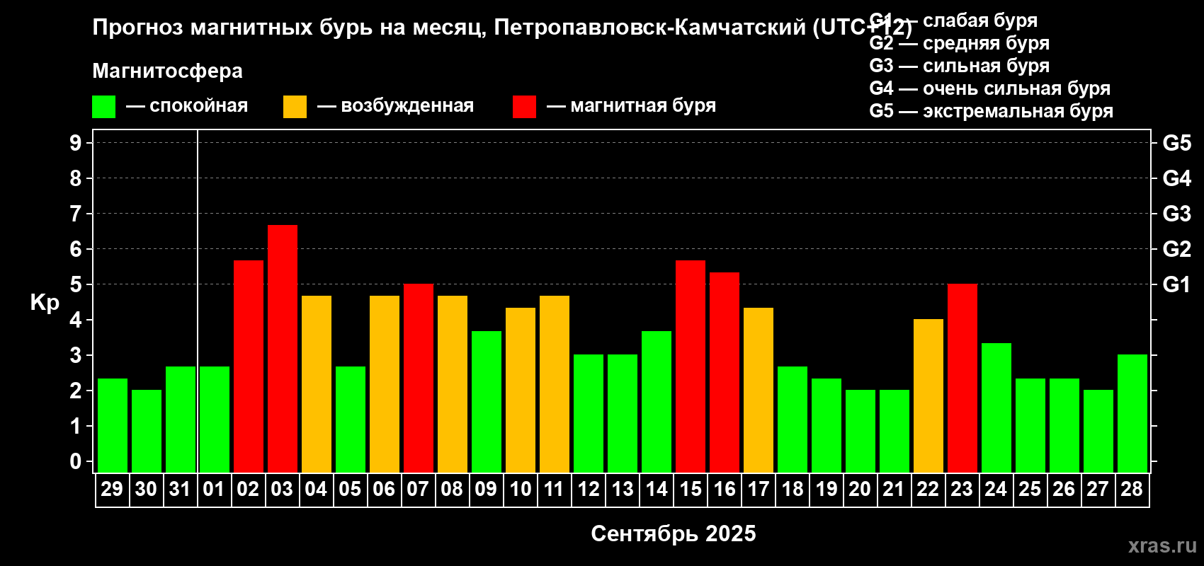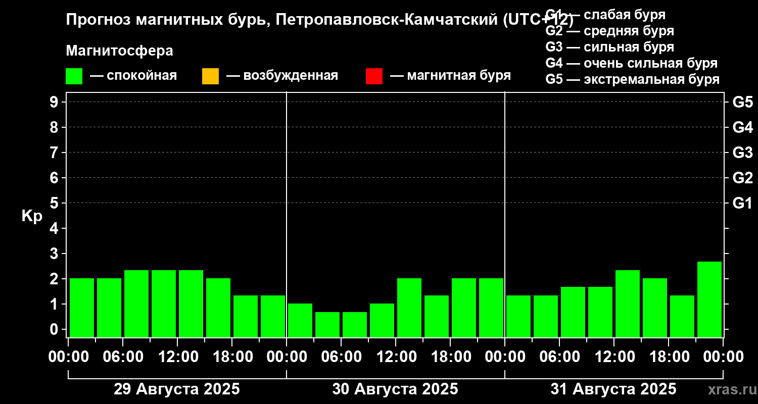 Прогноз магнитных бурь Петропавловске-Камчатском — 29 августа 2025 года