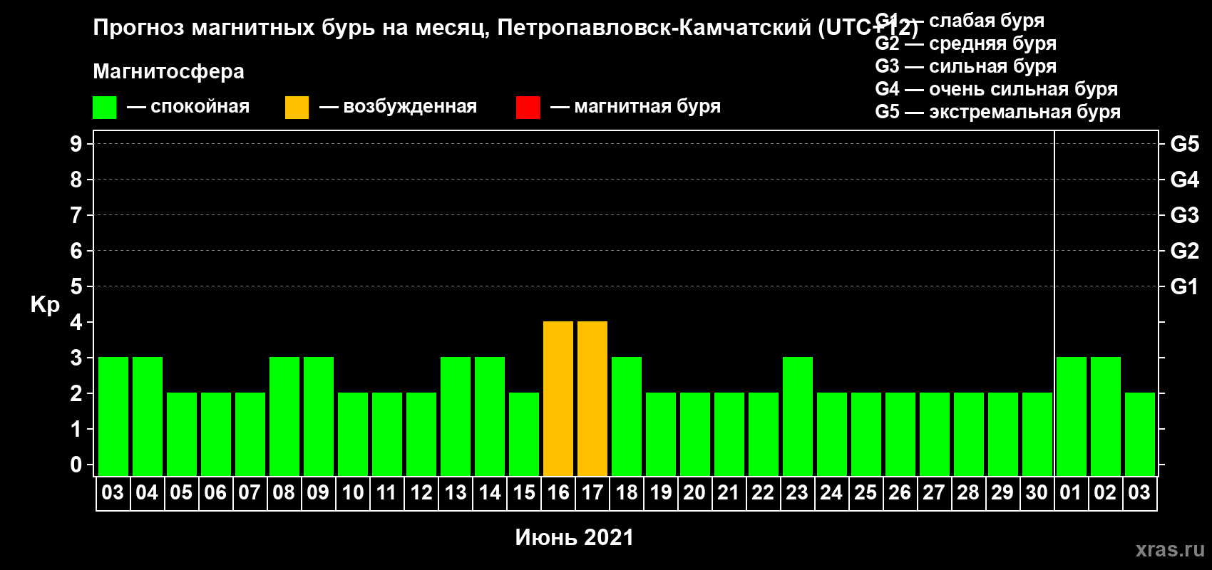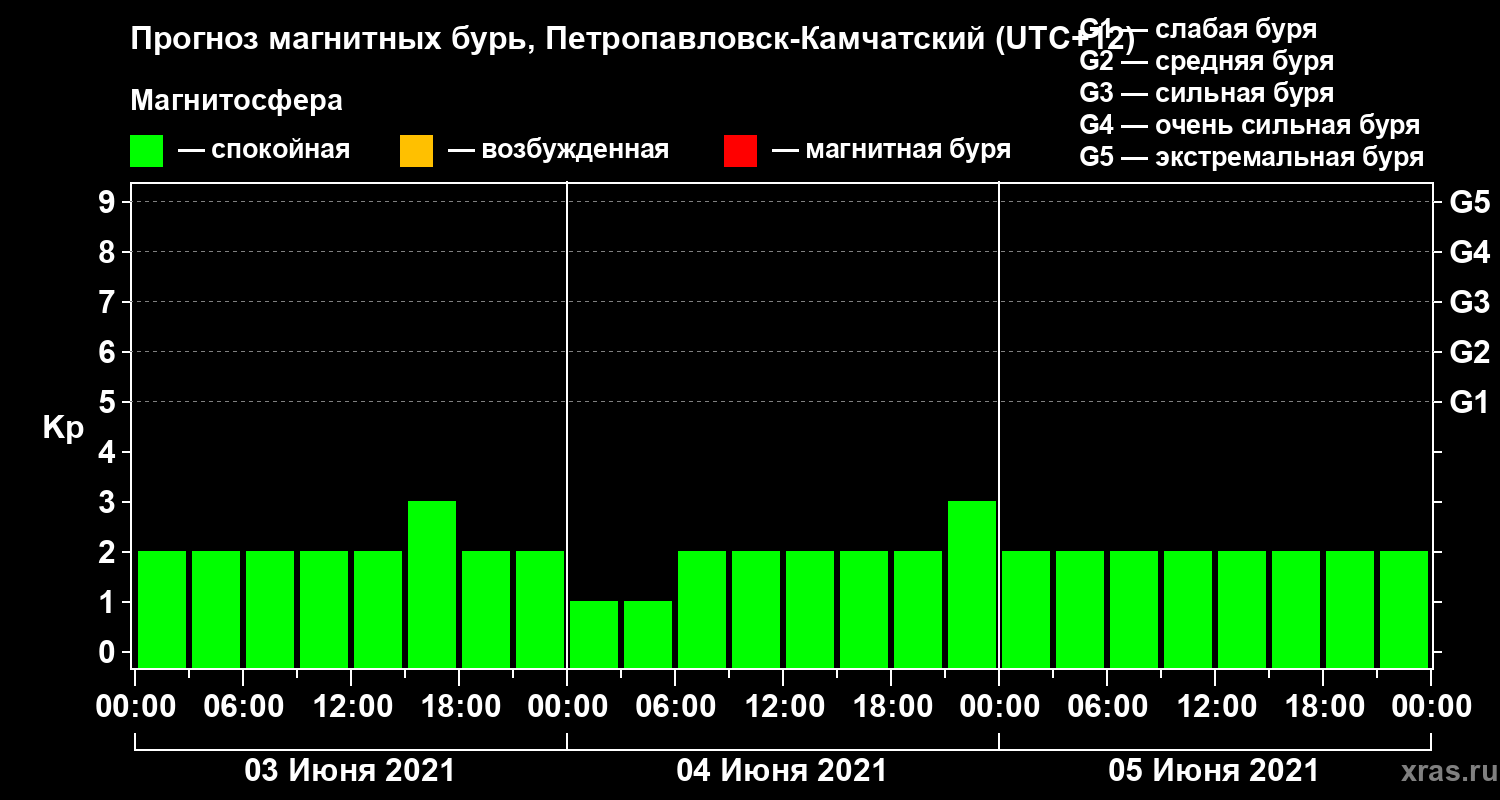 Прогноз магнитных бурь Петропавловске-Камчатском — 3 июня 2021 года