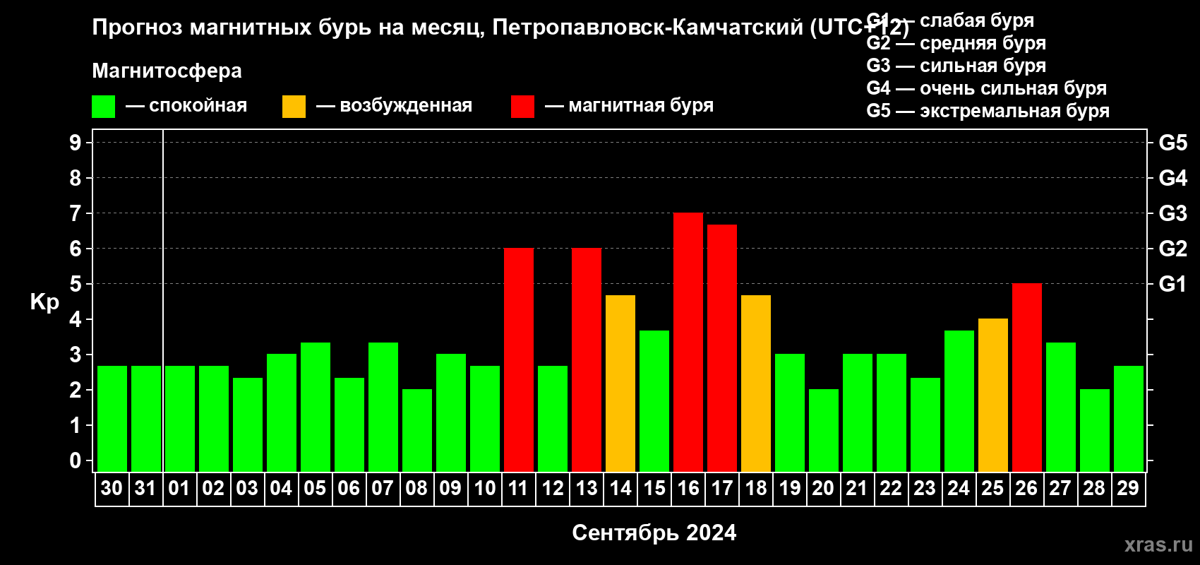 Прогноз магнитных бурь Петропавловске-Камчатском — 30 августа 2024 года