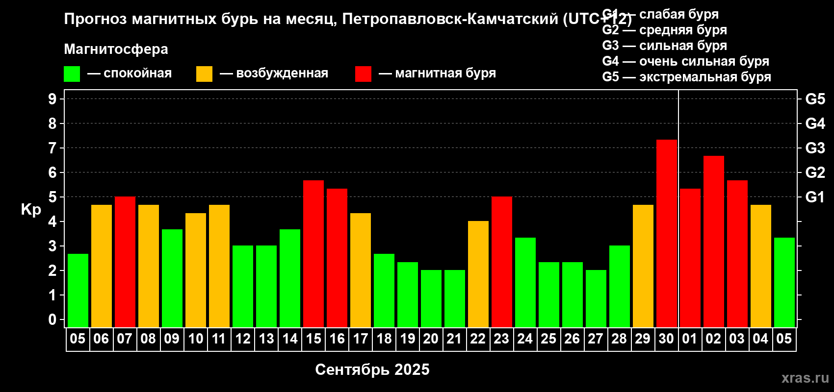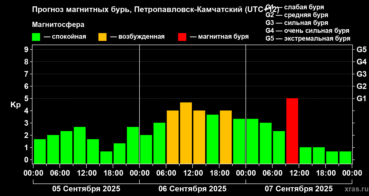 Прогноз магнитных бурь Петропавловске-Камчатском на 5 сентября 2025 года