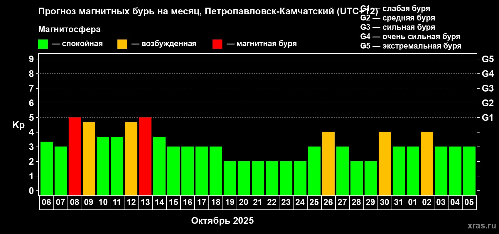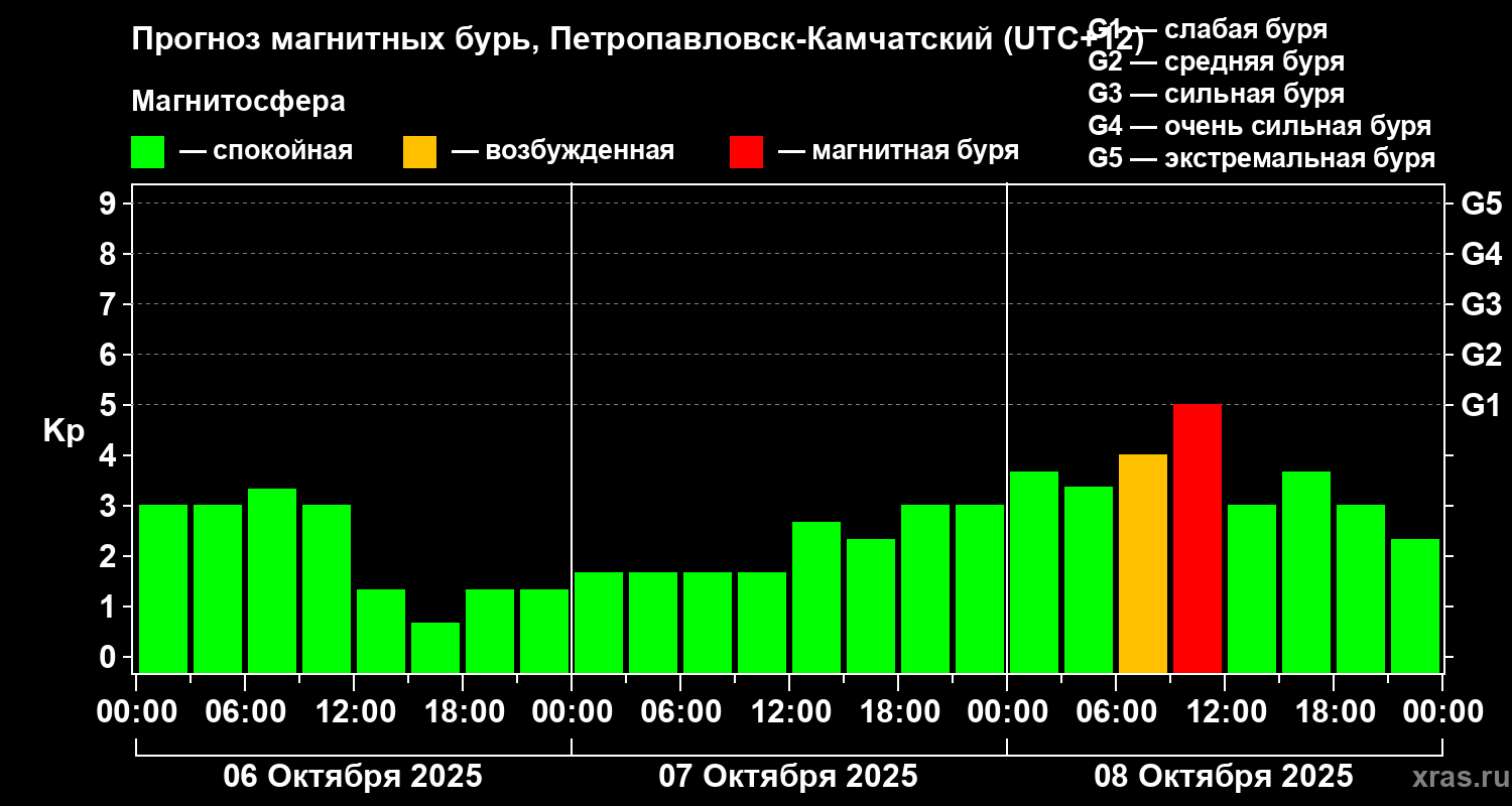 Прогноз магнитных бурь Петропавловске-Камчатском — 6 октября 2025 года