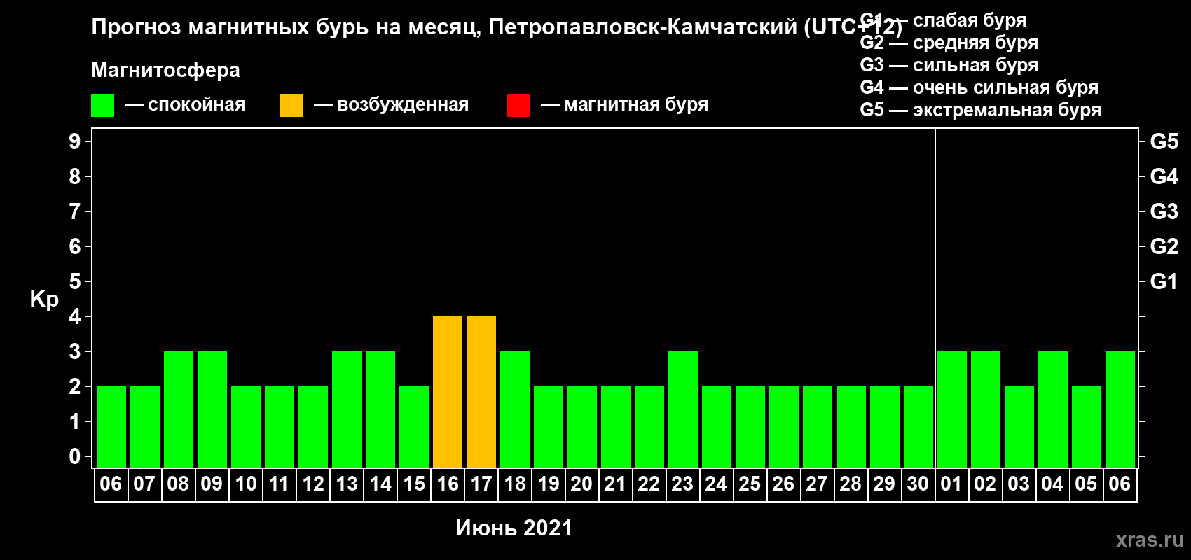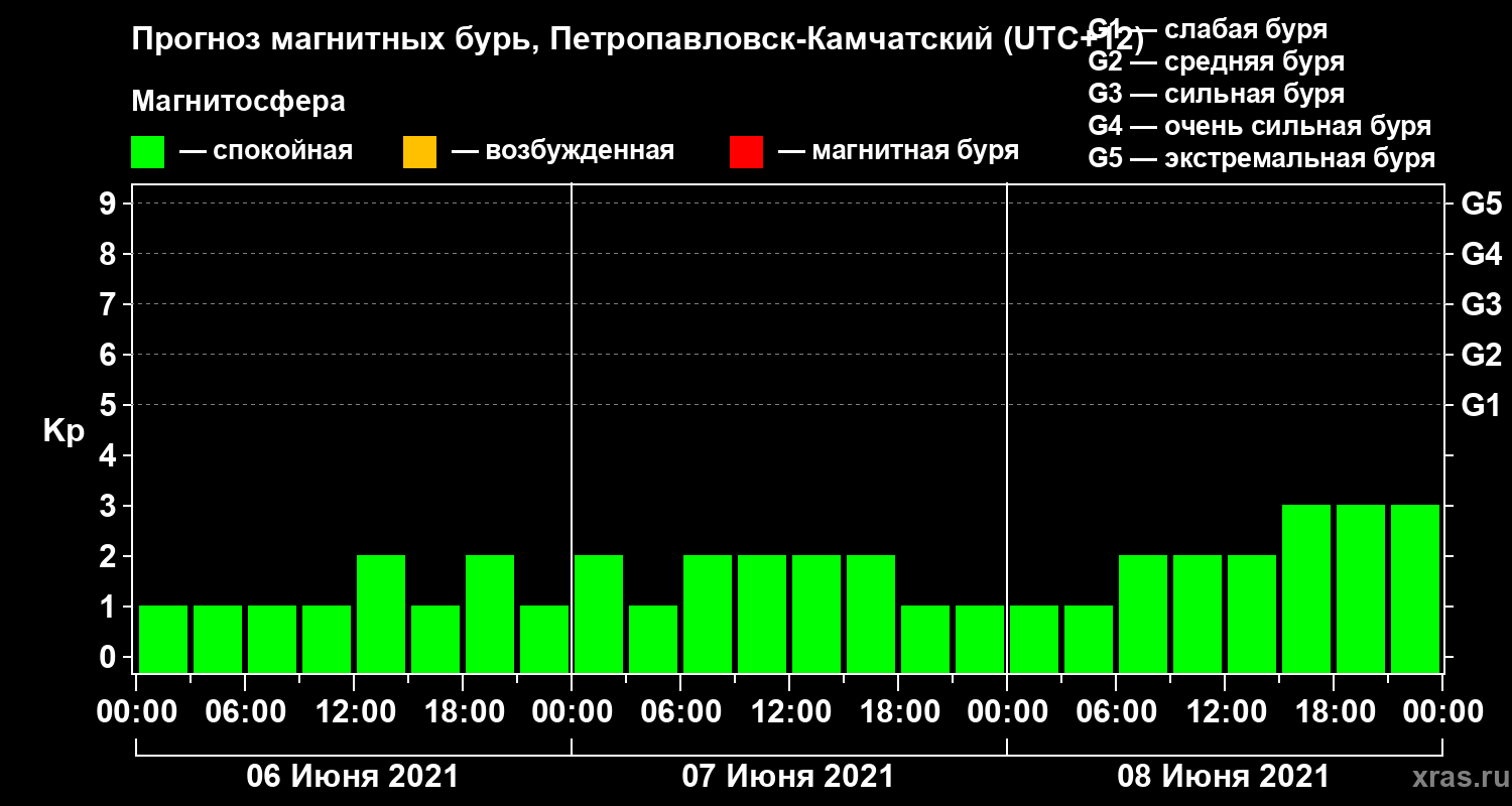 Прогноз магнитных бурь Петропавловске-Камчатском — 6 июня 2021 года
