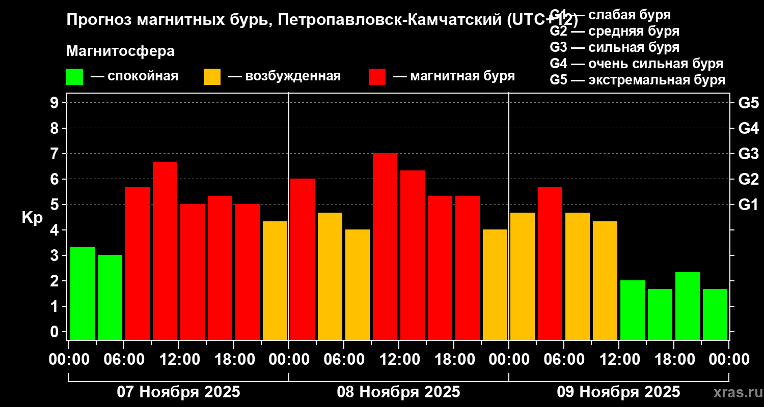 Прогноз магнитных бурь Петропавловске-Камчатском — 7 ноября 2025 года