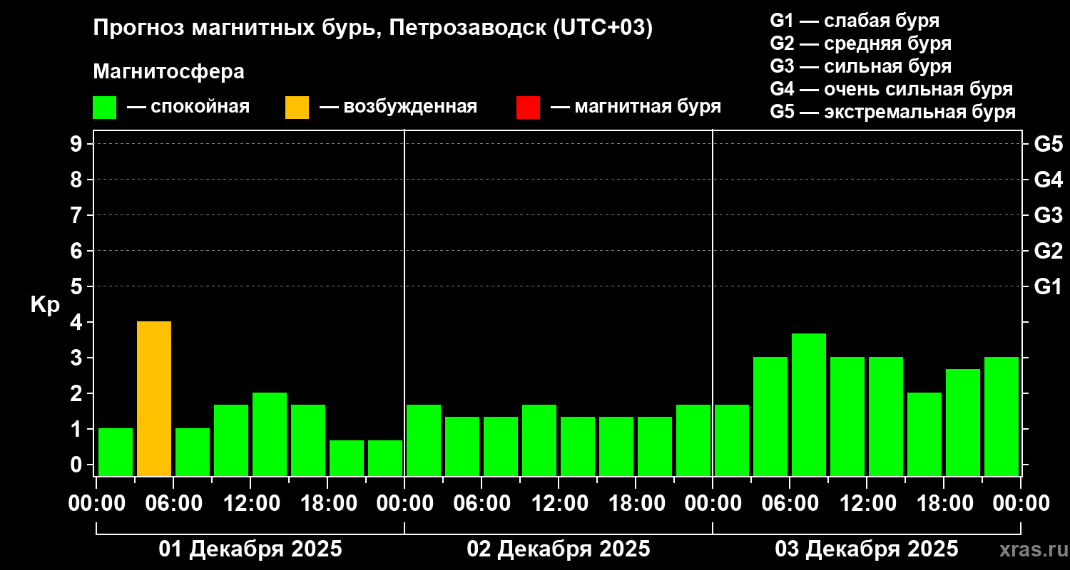 Прогноз магнитных бурь в Петрозаводске — 1 декабря 2025 года
