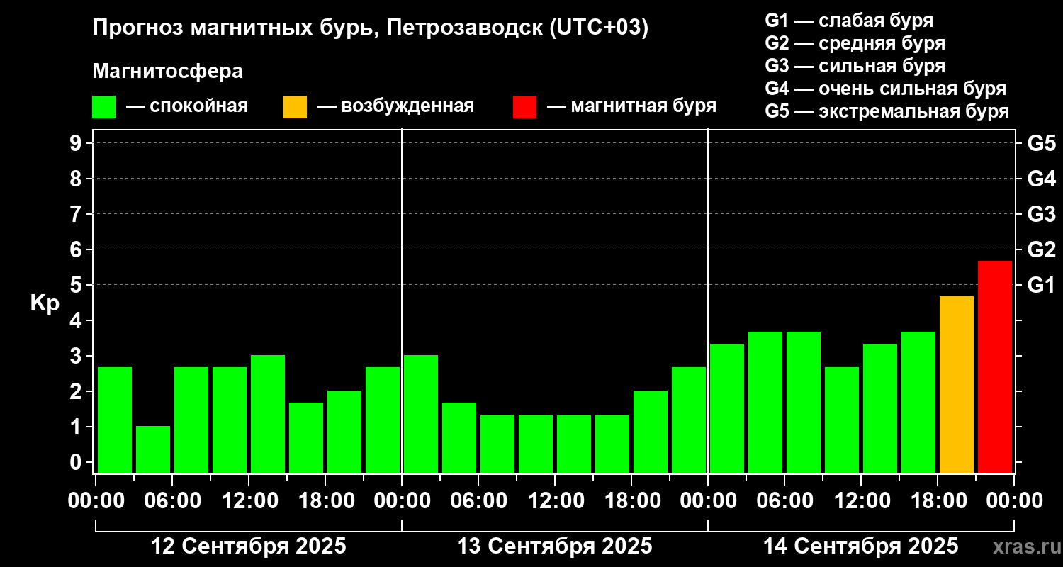 Прогноз магнитных бурь в Петрозаводске на 12 сентября 2025 года