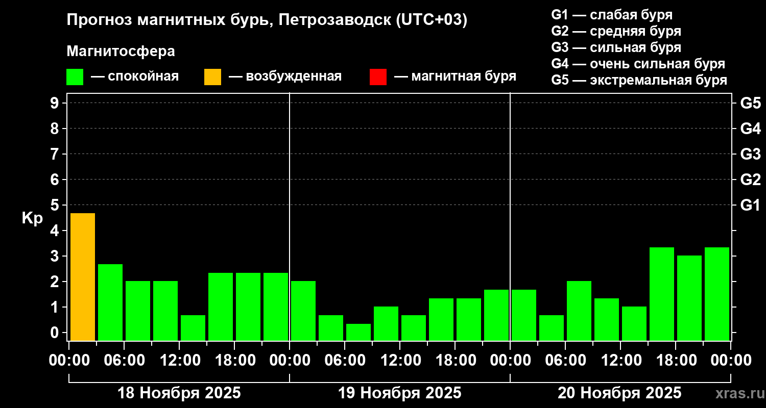 Прогноз магнитных бурь в Петрозаводске — 18 ноября 2025 года