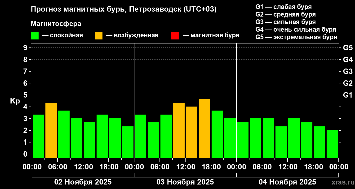 Прогноз магнитных бурь в Петрозаводске на 2 ноября 2025 года