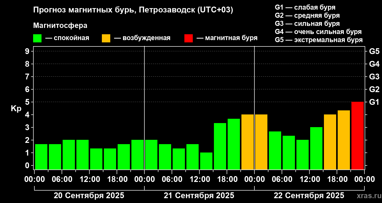 Прогноз магнитных бурь в Петрозаводске — 20 сентября 2025 года