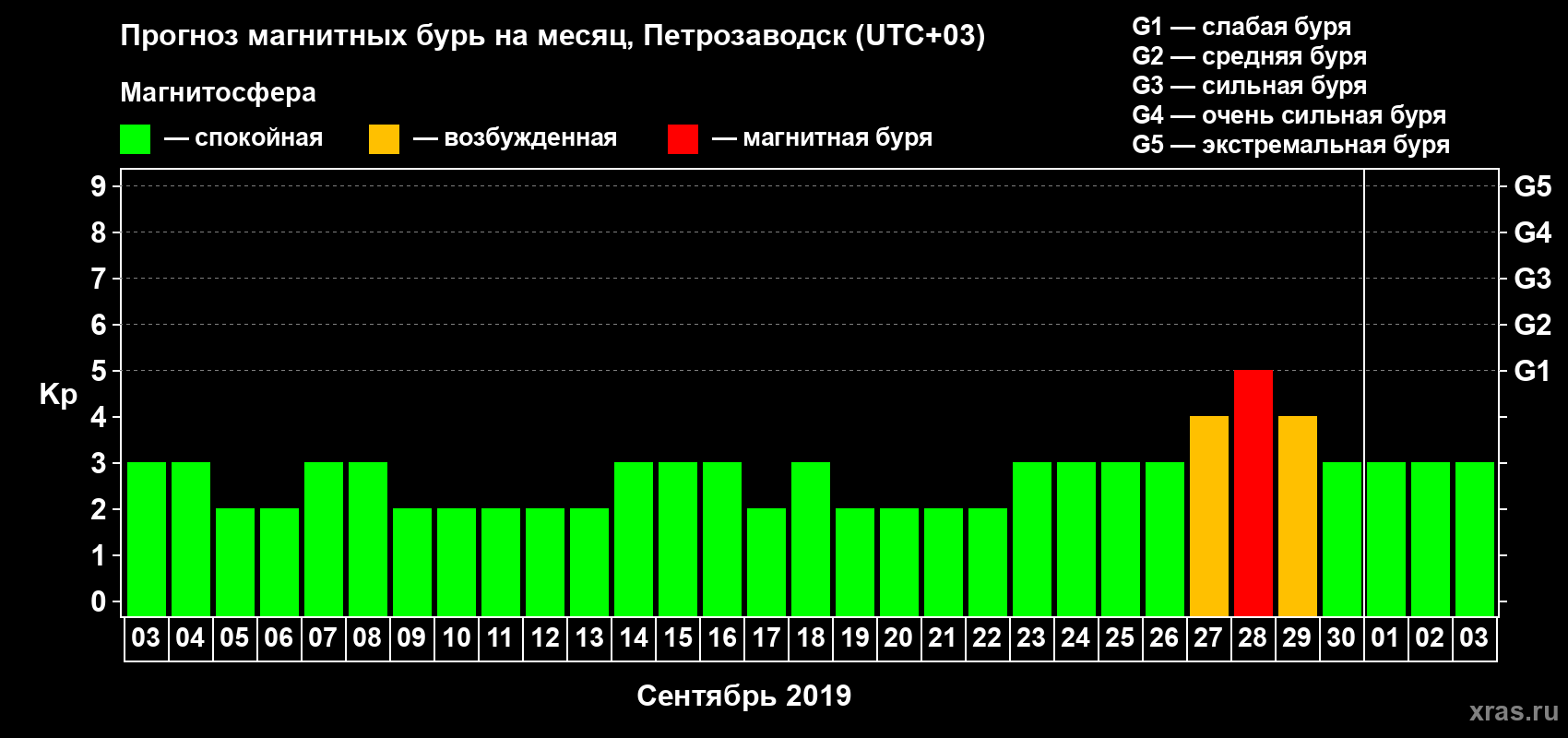 Прогноз магнитных бурь в Петрозаводске — 3 сентября 2019 года