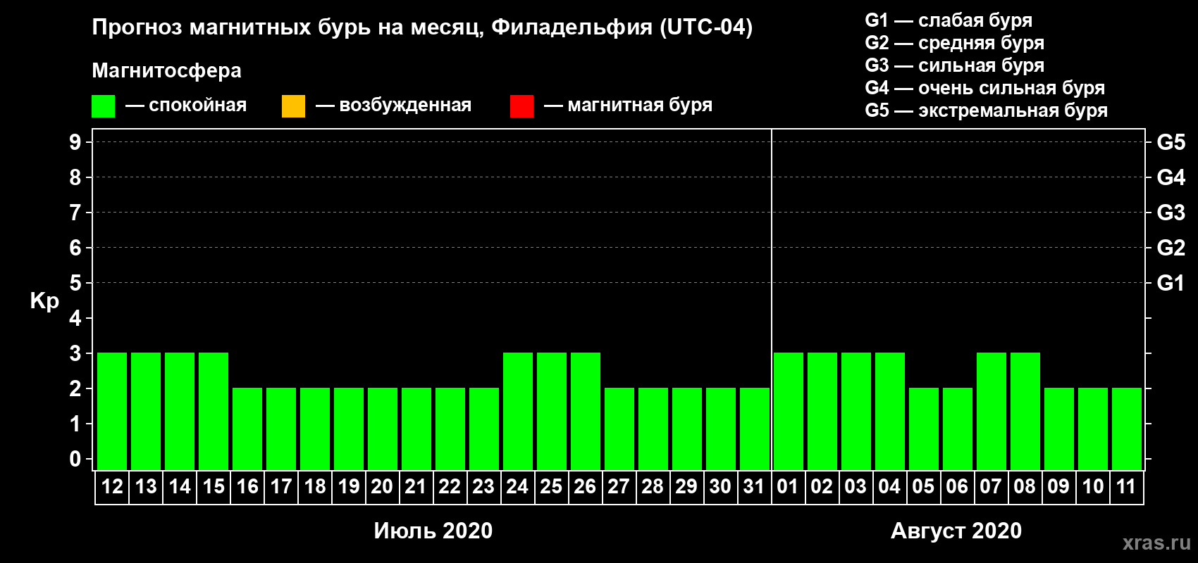 Прогноз магнитных бурь в Филадельфии — 12 июля 2020 года