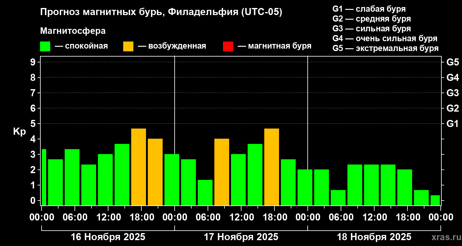 Прогноз магнитных бурь в Филадельфии на 16 ноября 2025 года
