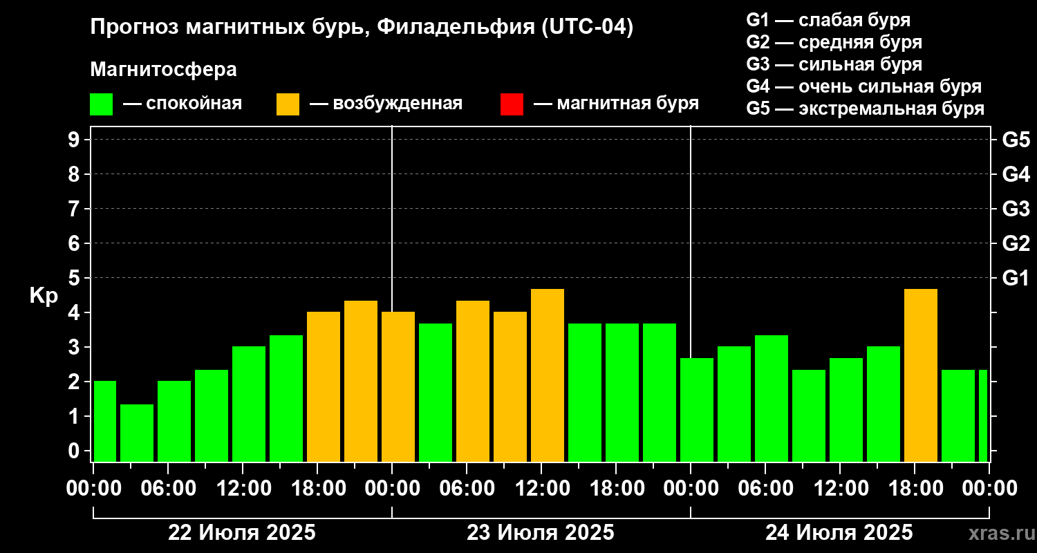 Прогноз магнитных бурь в Филадельфии — 22 июля 2025 года
