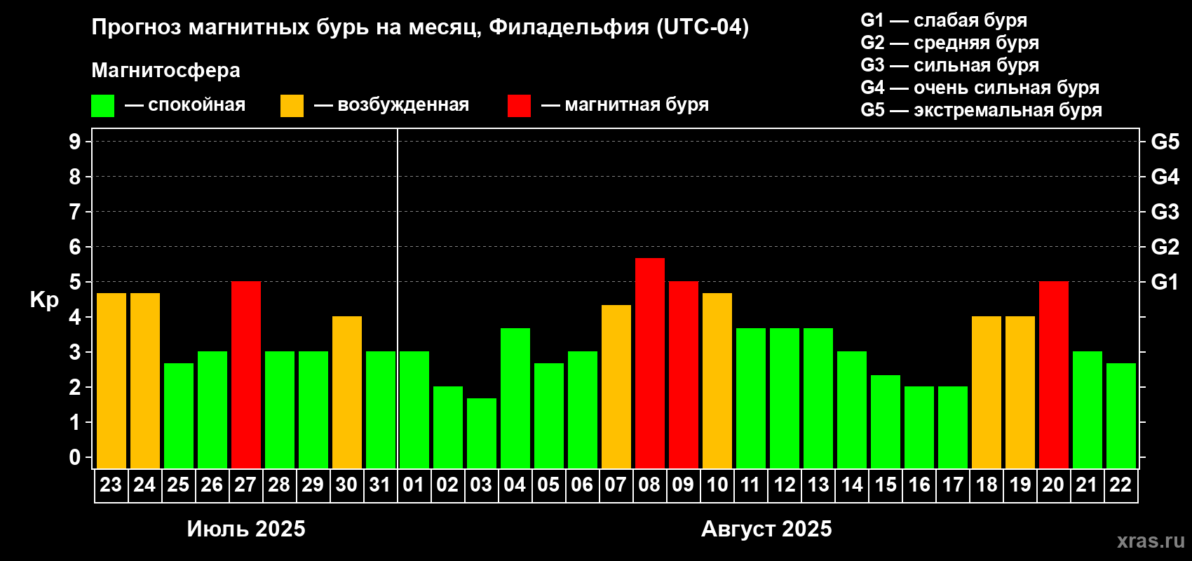 Прогноз магнитных бурь в Филадельфии — 23 июля 2025 года