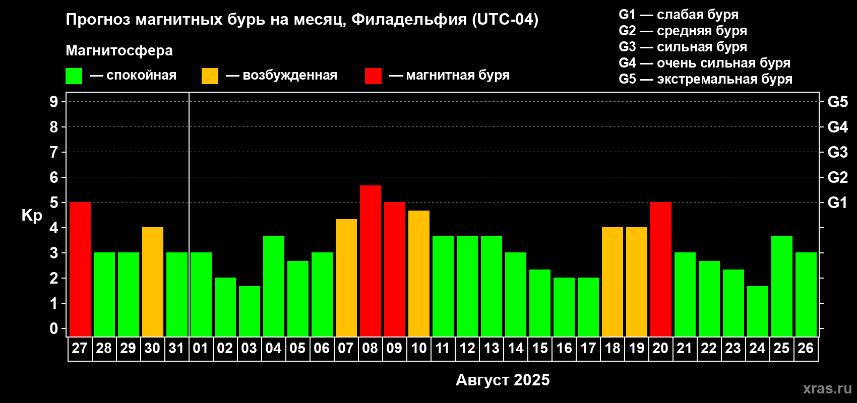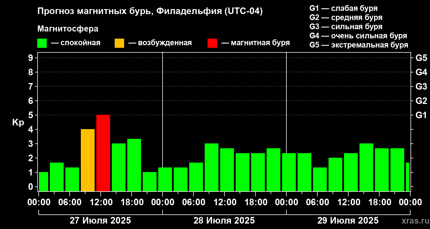 Прогноз магнитных бурь в Филадельфии — 27 июля 2025 года