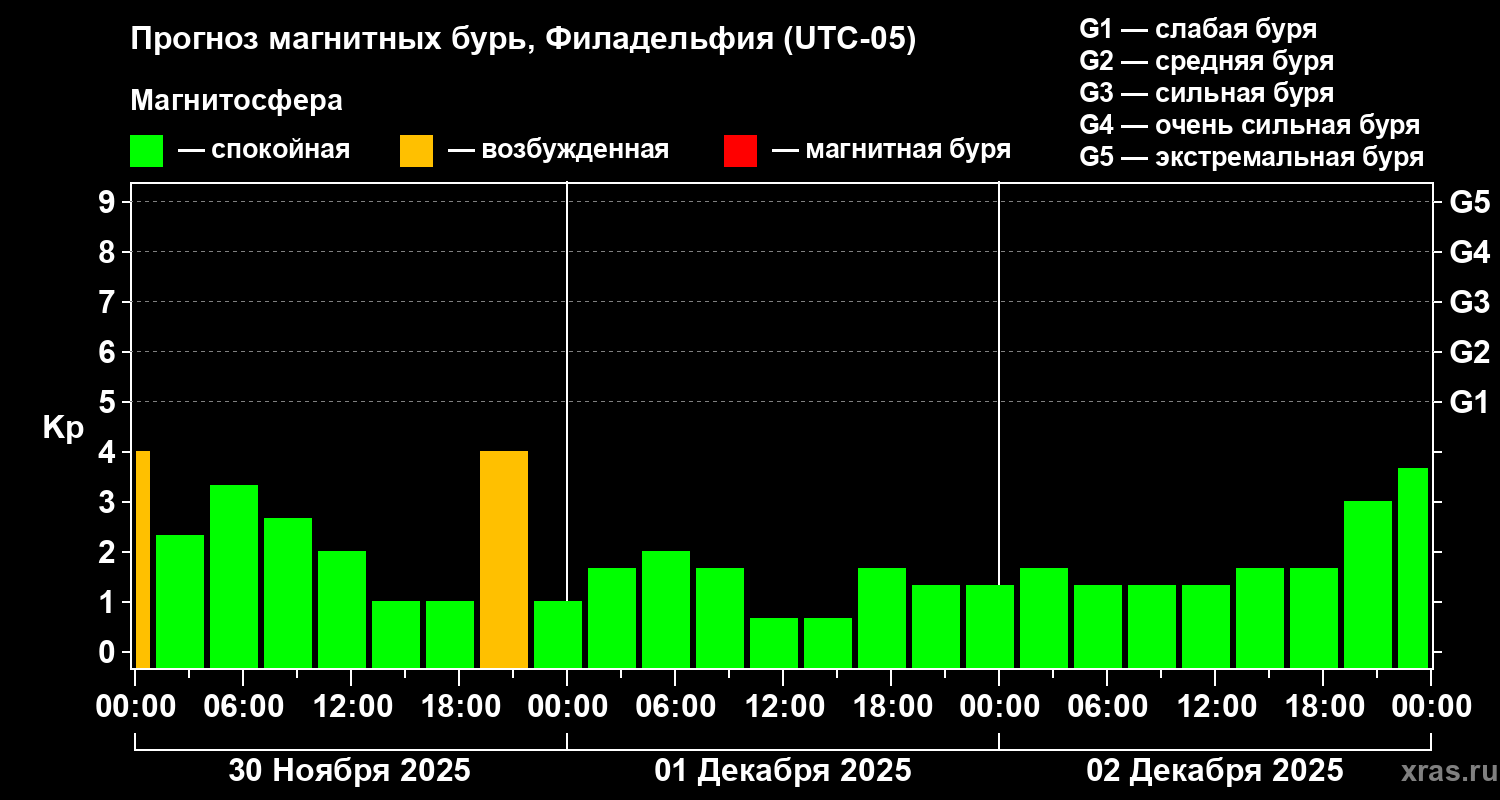Прогноз магнитных бурь в Филадельфии на 30 ноября 2025 года