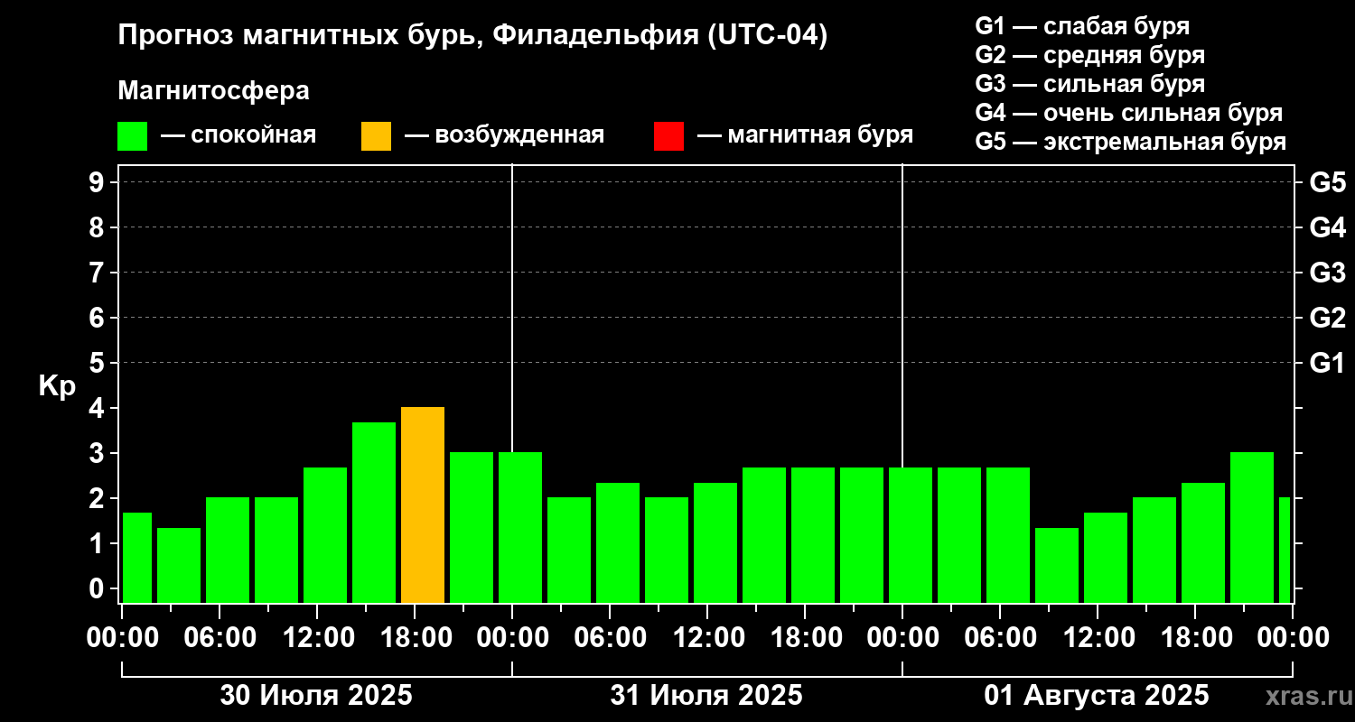 Прогноз магнитных бурь в Филадельфии на 30 июля 2025 года